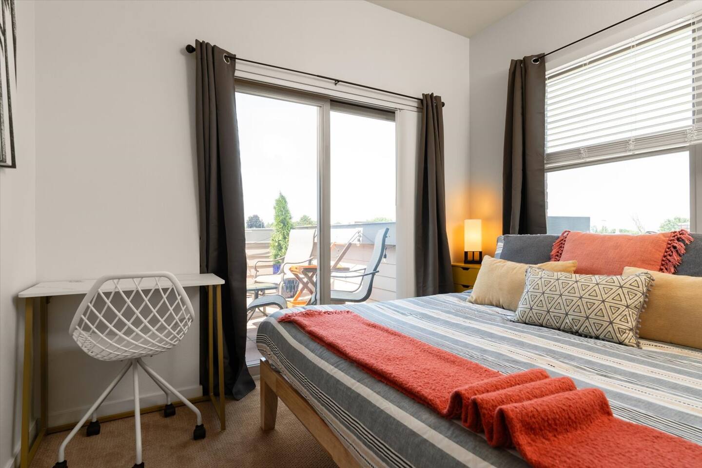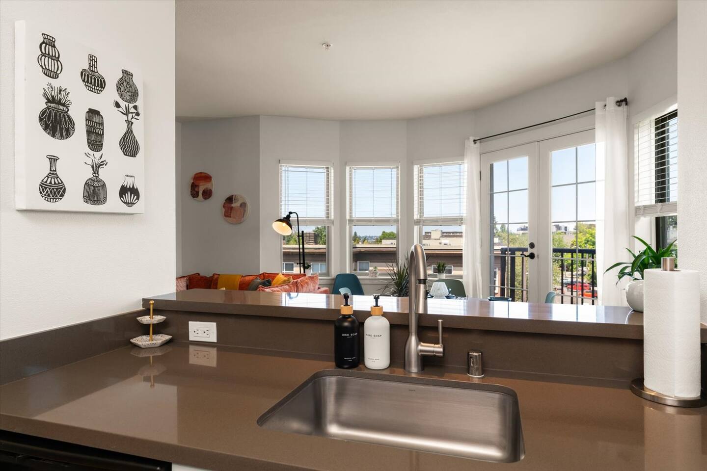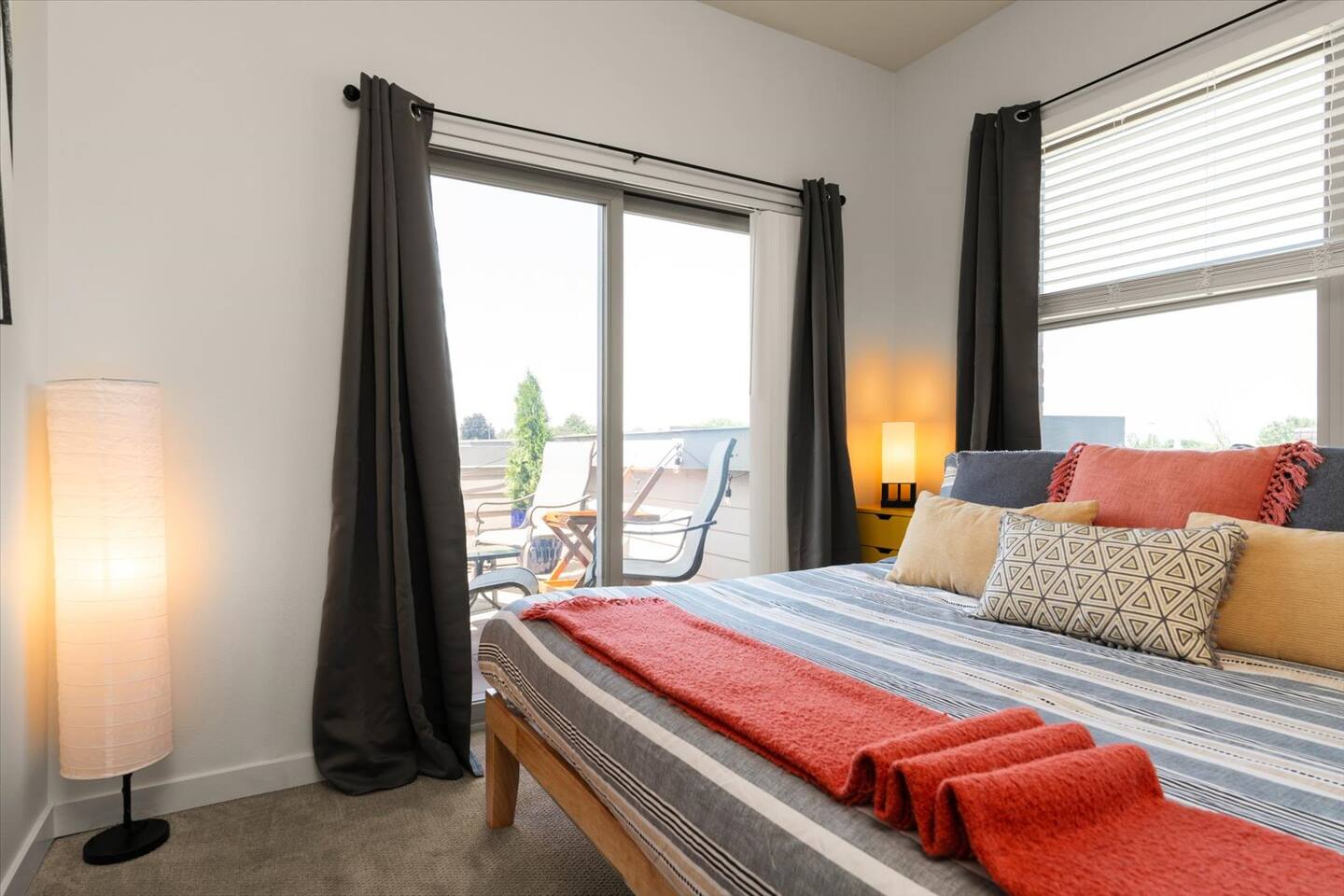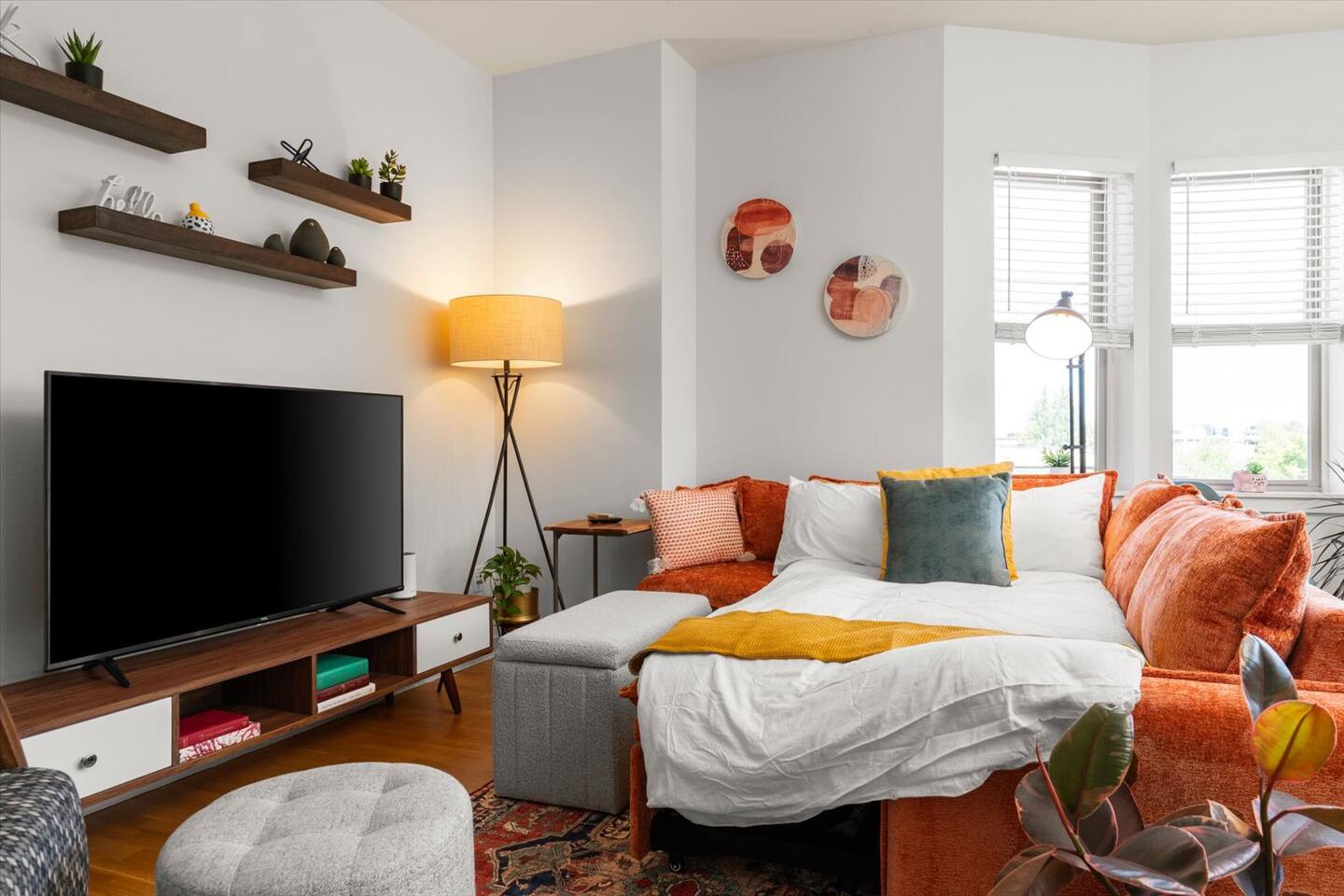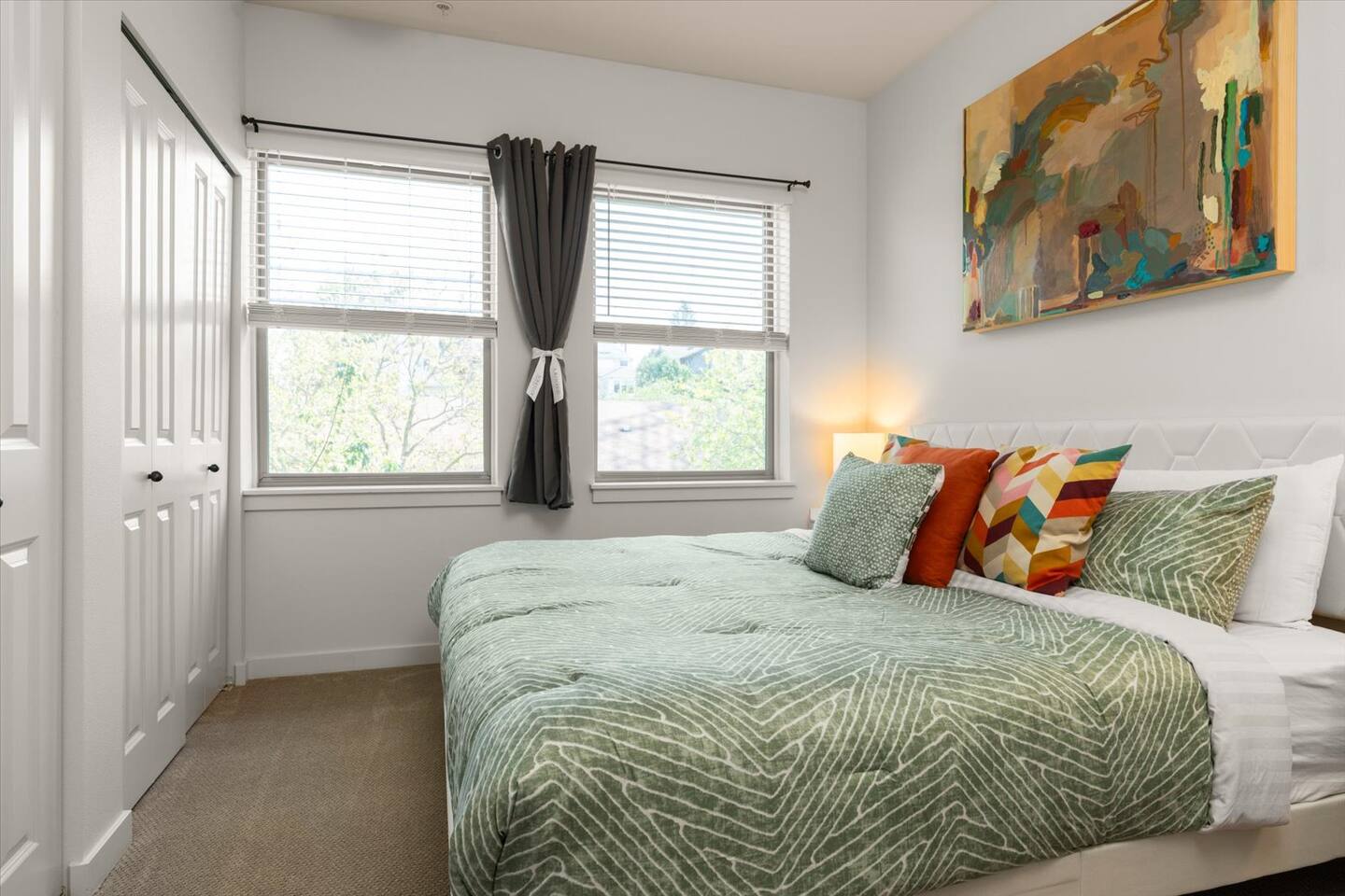 Step into this boho inspired, 1100 square foot (with 300 square foot private rooftop patio!) two-bedroom haven and be greeted by polished hardwood floors, elegant furniture, live plants, quartz countertops, and sleek stainless steel appliances. Each bedroom comes with a foldable work desk and chair in case you need privacy amongst a larger travel group while working from home. Morning light streaming through the east facing windows will not disappoint as you start your day with free coffee or tea. The wifi is super fast, and with the convenience of a large washer and dryer in unit you'll feel right at home here in the Emerald City.