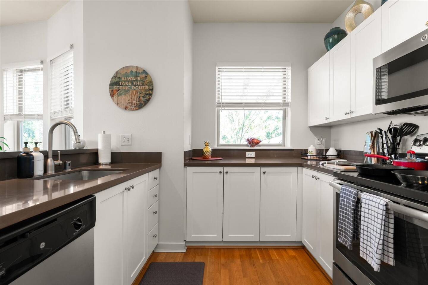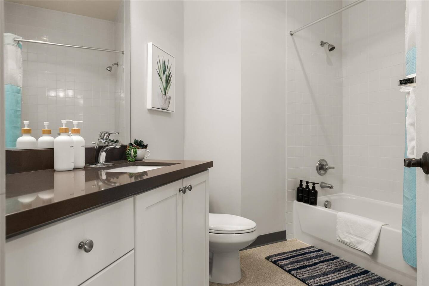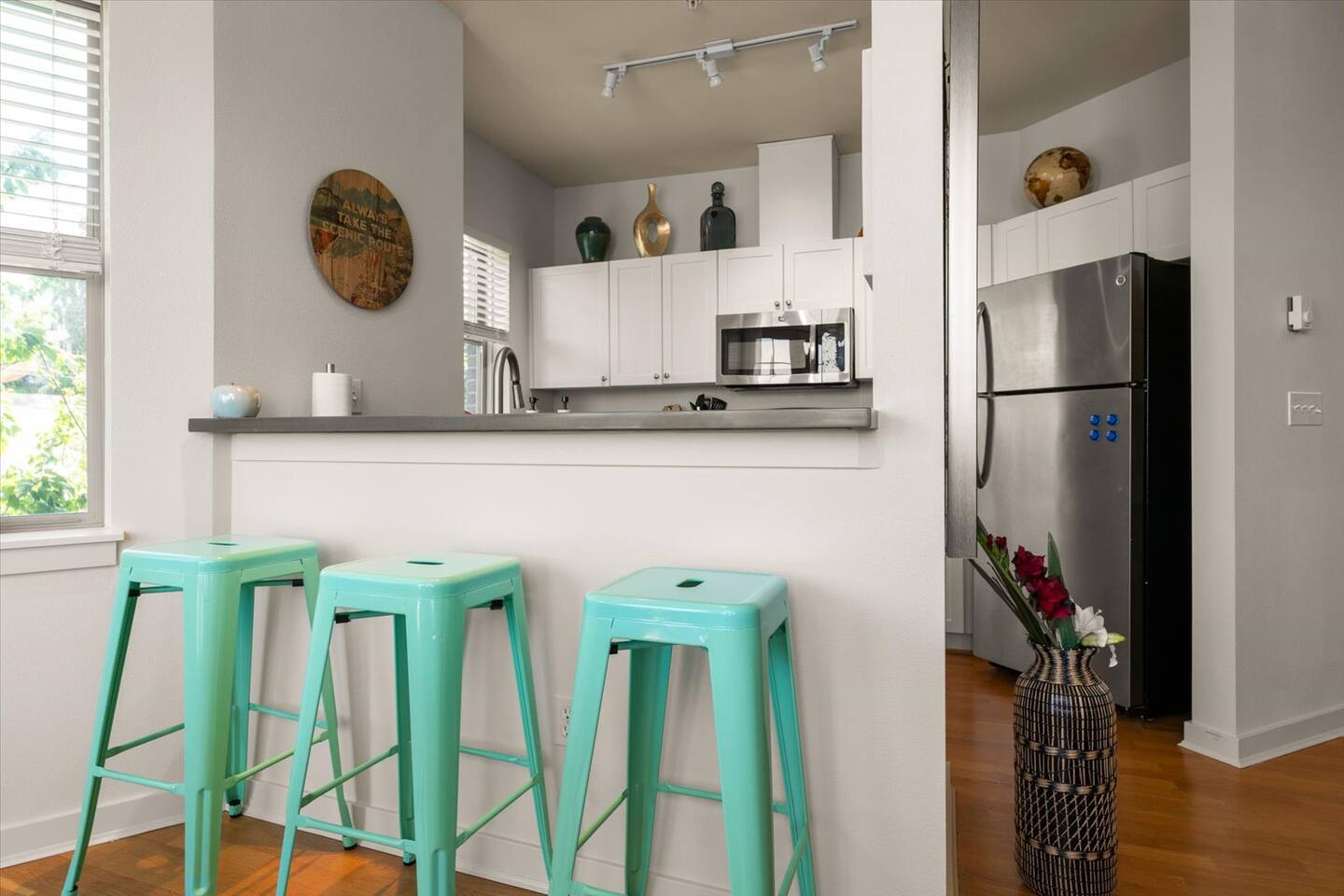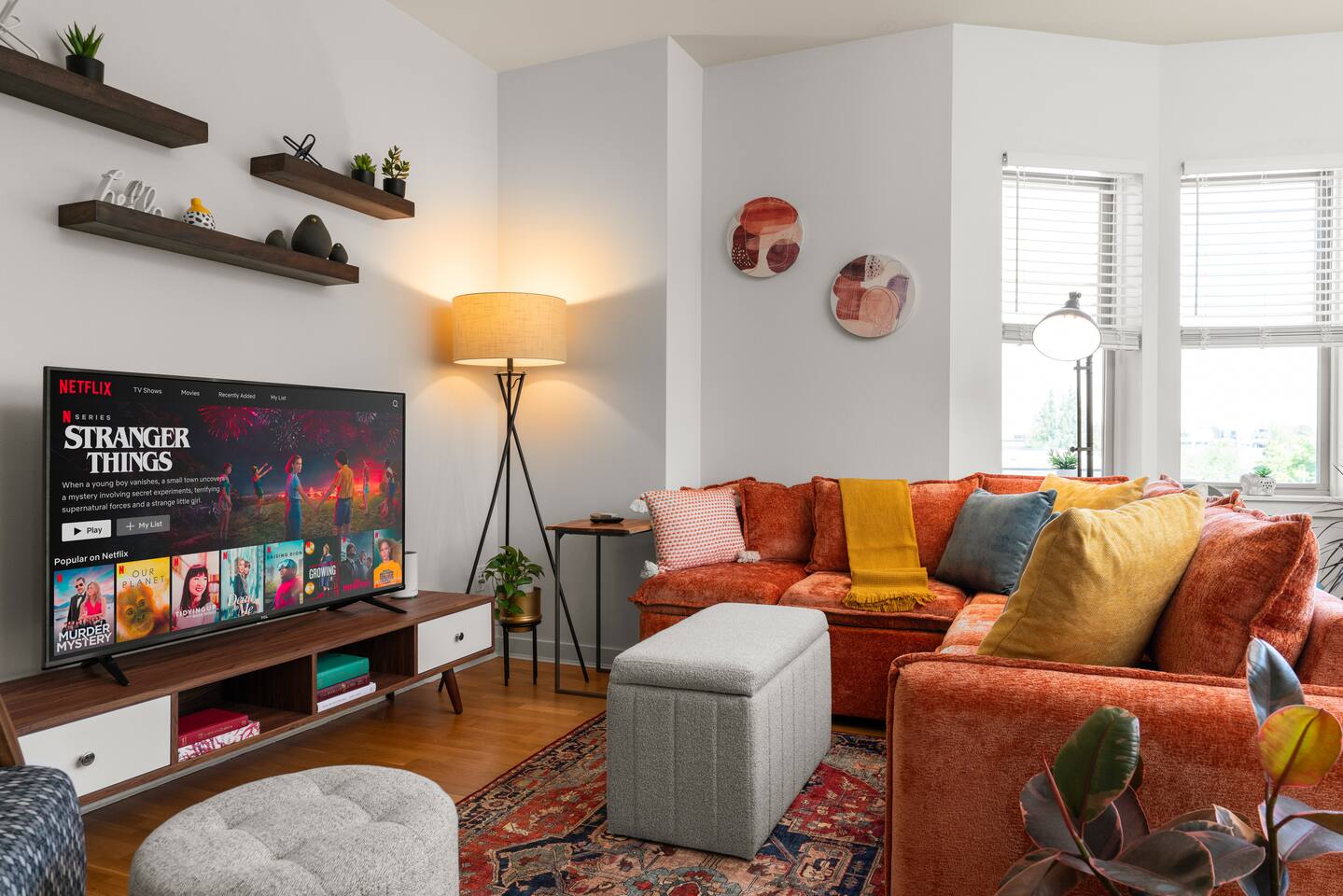 Step into this boho inspired, 1100 square foot (with 300 square foot private rooftop patio!) two-bedroom haven and be greeted by polished hardwood floors, elegant furniture, live plants, quartz countertops, and sleek stainless steel appliances. Each bedroom comes with a foldable work desk and chair in case you need privacy amongst a larger travel group while working from home. Morning light streaming through the east facing windows will not disappoint as you start your day with free coffee or tea. The wifi is super fast, and with the convenience of a large washer and dryer in unit you'll feel right at home here in the Emerald City.