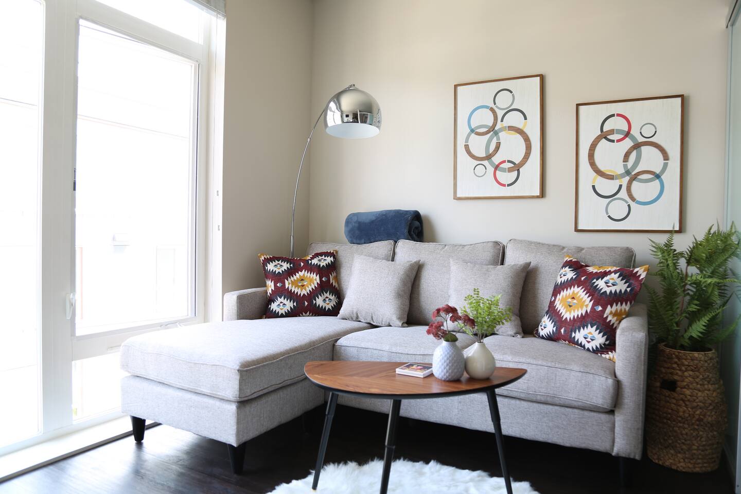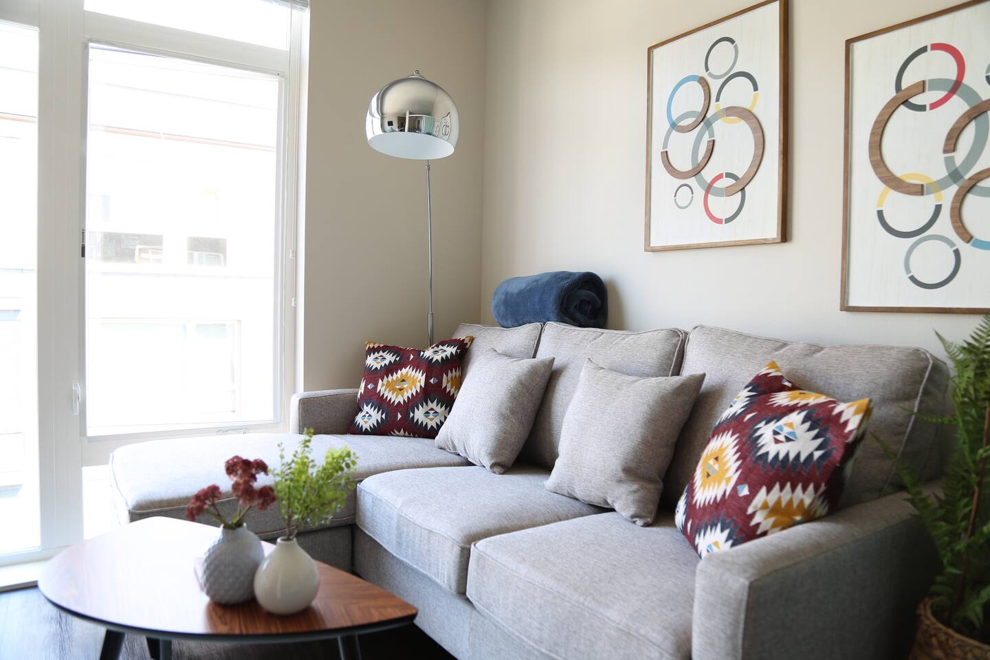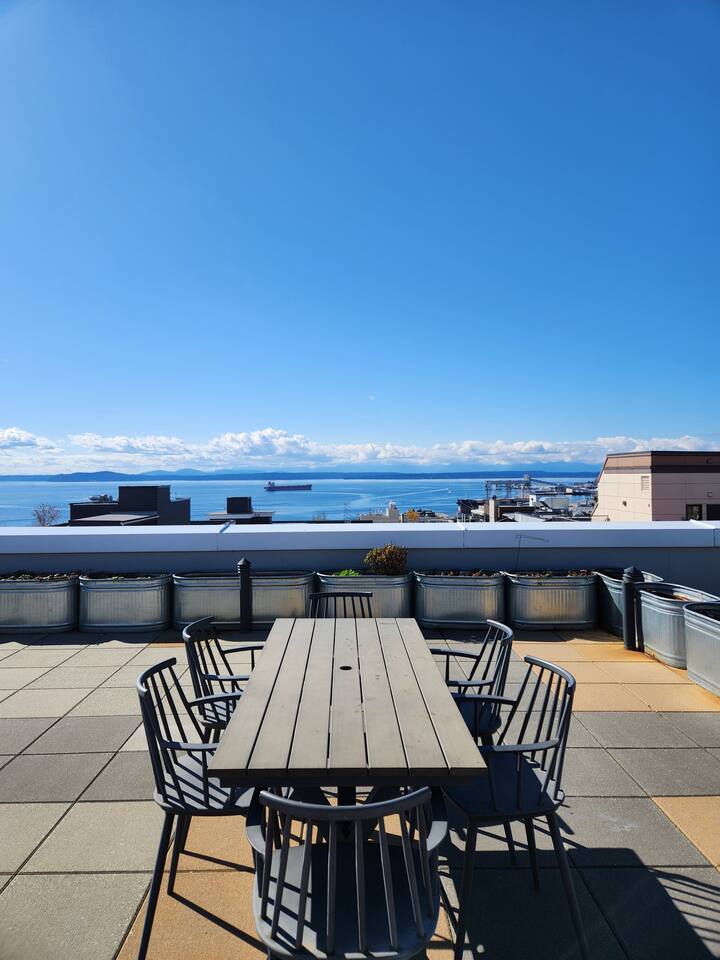 The Lower Queen Anne retreat boasts a 96 walk score and is steps away from Climate Pledge Arena and numerous other Seattle destinations. Lounge in the contemporary styled living room with the Smart TV, whip up a home cooked meal on the quartz countertops, or enjoy a glass of wine on the rooftop with incredible views overlooking Downtown, the Waterfront and Space Needle! A street parking pass is included in your stay but be aware street parking can be difficult at times.