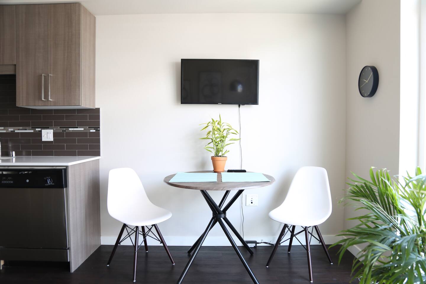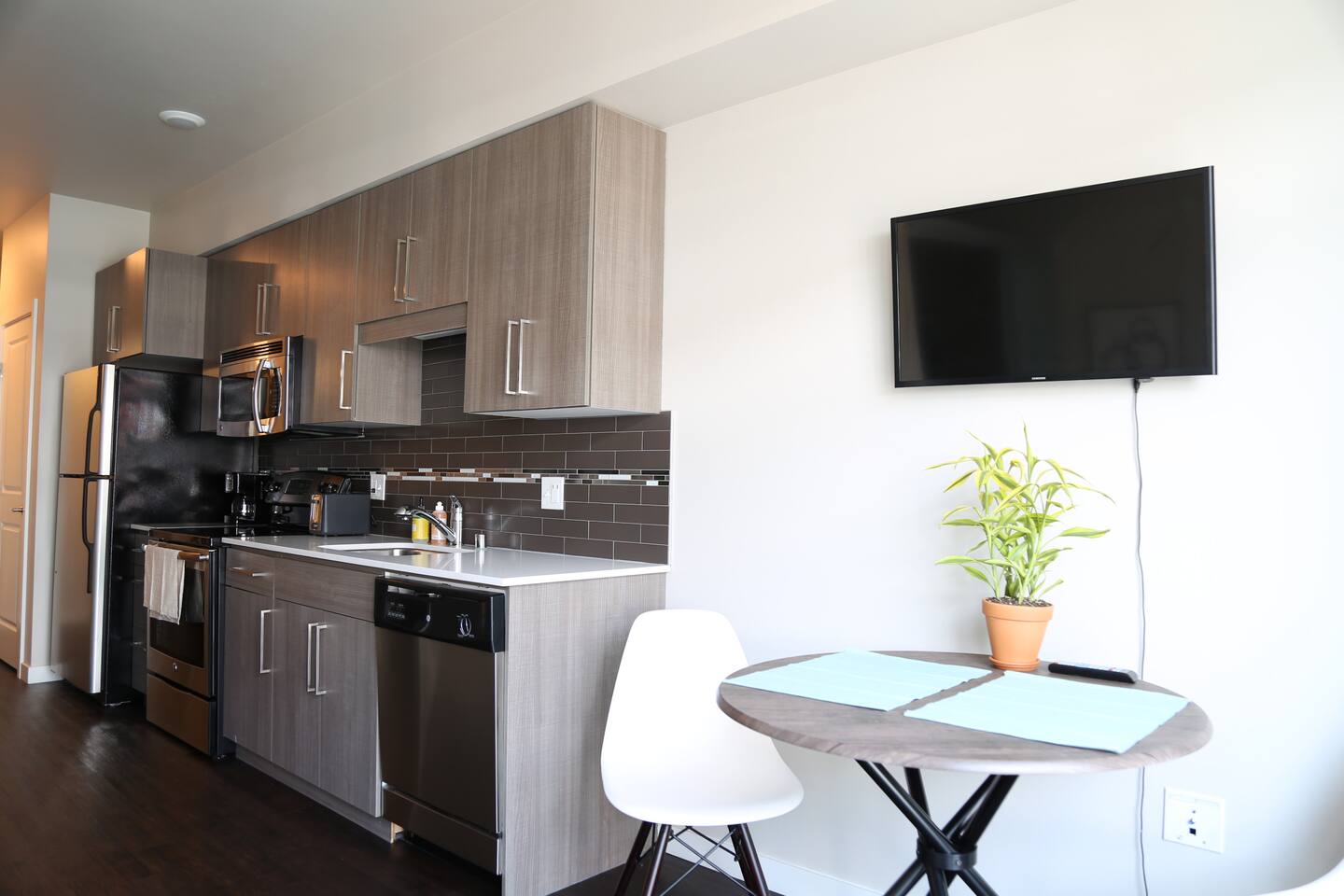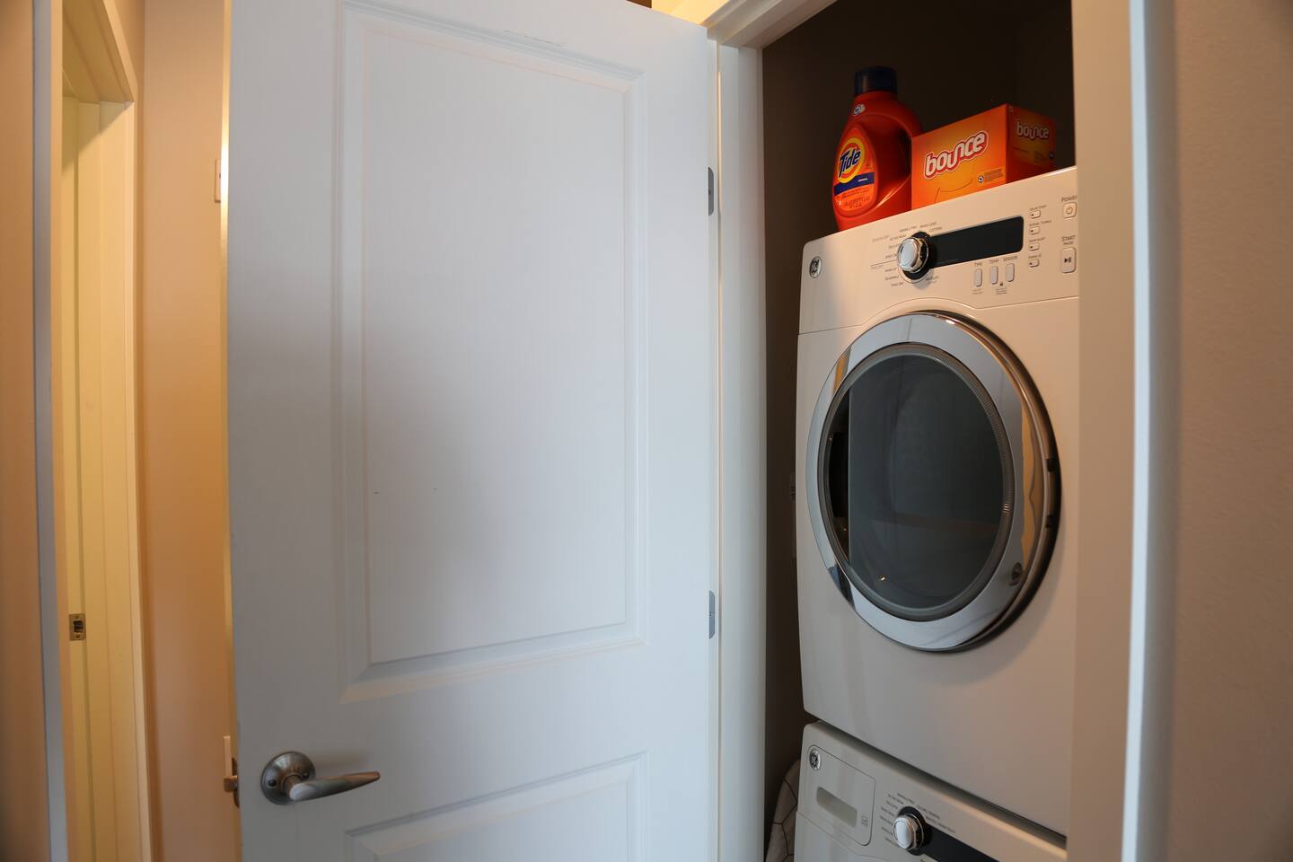 The TV is a smart TV so you can watch your favorite shows on Netflix, Hulu, Youtube TV, etc. There is also a washer and dryer in unit.